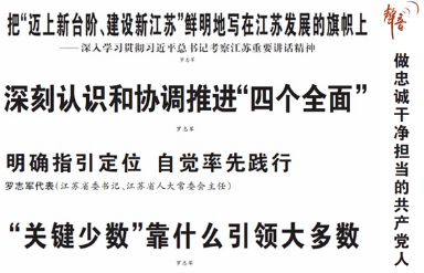 5篇文章中,“四個全面”、“三嚴(yán)三實”成為關(guān)鍵詞。一方面江蘇的發(fā)展方向是“要緊緊圍繞‘兩個率先’的光榮使命,努力建設(shè)經(jīng)濟(jì)強(qiáng)、百姓富、環(huán)境美、社會文明程度高的新江蘇”;另一方面,“治國必先治黨,治黨務(wù)必從嚴(yán)。”黨員領(lǐng)導(dǎo)干部要學(xué)習(xí)、踐行“三嚴(yán)三實”,如果修身用權(quán)律己不嚴(yán)、謀事創(chuàng)業(yè)做人不實,“黨心民心就會渙散,‘邁上新臺階、建設(shè)新江蘇’就會成為一句空話。”
