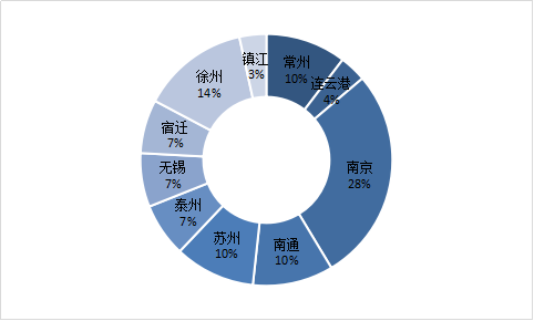 除去省級單位及部屬、省屬高校等,按地域分布,江蘇13市中10市上榜,南京占比最多,其次是徐州。