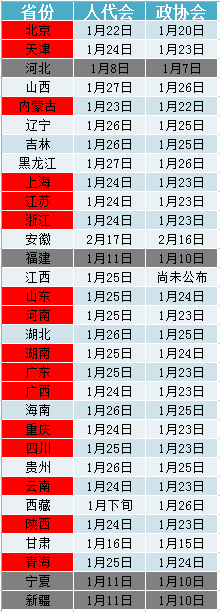 目前,僅江西省政協(xié)會議召開時間尚未公開;安徽省兩會擬定2016年春節(jié)假期過后召開。