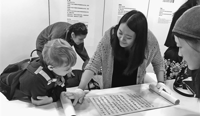 近日,紐約當(dāng)?shù)匦∨笥褏⒓?ldquo;歡樂春節(jié)·藝術(shù)中國匯”系列活動,近距離欣賞中國書法作品。