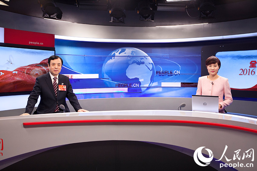 全國人大代表、安徽省財(cái)政廳黨組書記、廳長羅建國與人民網(wǎng)主持人在演播室。