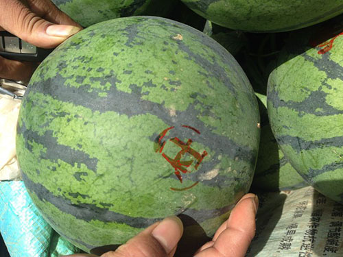 據(jù)市場招商部負責(zé)人牛廣超介紹,這種早熟山地瓜口感明顯與緬甸、越南等南方西瓜不同,沙、脆,甜,黑籽紅壤,雖然價格略高,銷售行情依然很好。市場西瓜銷售商不僅坐鎮(zhèn)田間地頭親自把關(guān),做到不是優(yōu)質(zhì)西瓜不摘,而且每家都在自己銷售的西瓜上蓋了印章,確保西瓜品質(zhì)可追溯。目前市場每天銷量十萬斤左右。