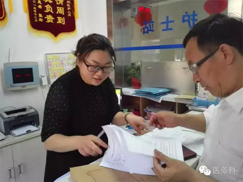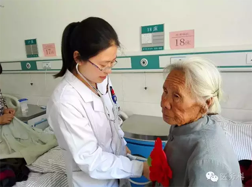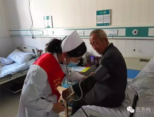 醫(yī)師李楠楠正在對(duì)革命功臣查體,為每一位功臣建立健康檔案!