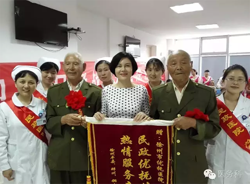 中國(guó)黃淮網(wǎng)訊(采編:楊先凱  曹紅)5月27日上午,第一批來(lái)自銅山、賈汪、豐縣及邳州的36名首批重點(diǎn)優(yōu)撫對(duì)象療養(yǎng)結(jié)束,他們?cè)陔x開(kāi)徐州民政醫(yī)院前,將一面寫有“民政優(yōu)撫情暖老兵 熱情服務(wù)親如一家”的錦旗送到副院長(zhǎng)沈青等工作人員手中,以感謝黨和政府對(duì)他們的關(guān)心與關(guān)愛(ài),感謝民政醫(yī)院工作人員對(duì)他們無(wú)微不至的服務(wù)和照顧。