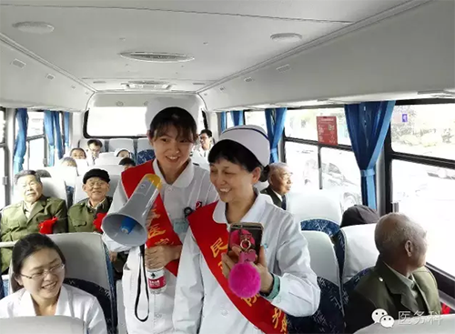 旅途中護(hù)士長(zhǎng)朱槿、董薇、李楠楠、李秋麗、朱媛媛、王瑤、王媛媛、曹靜等醫(yī)護(hù)人員為老同志獻(xiàn)歌......整個(gè)車廂充滿了歡聲笑語(yǔ)。