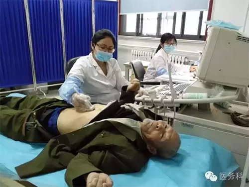 彩超室醫(yī)師張琛琛、林琳正在認(rèn)真為功臣進(jìn)行腹部彩超檢查!