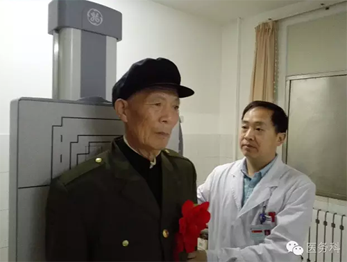 放射科副主任醫(yī)師董祥保正在認(rèn)真為老戰(zhàn)士進(jìn)行胸部X線檢查!