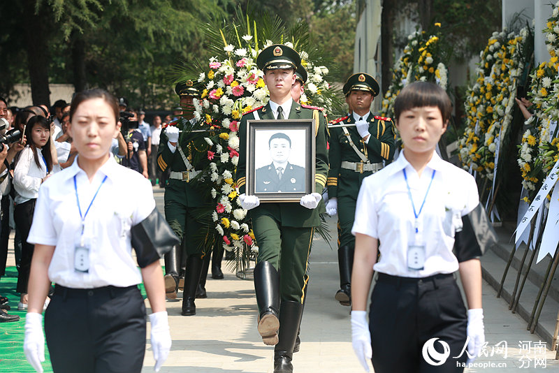 2016年6月13日的溫縣,舉城同悲。上午8時(shí),在6名禮兵的護(hù)送下,烈士的骨灰從溫縣殯儀館靈堂移出,緩緩向烈士陵園進(jìn)發(fā)。