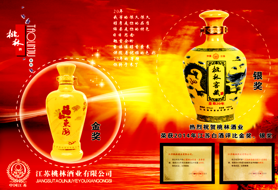 桃林大曲曾多次榮獲國(guó)家、省市級(jí)大獎(jiǎng)。1985年獲連云港市優(yōu),1987年獲江蘇省優(yōu),1988年獲首屆中國(guó)食品博覽會(huì)銀獎(jiǎng)。產(chǎn)品桃林窖藏“福如東海”和“皇尊20年”在2014年江蘇省白酒品評(píng)感官會(huì)上被評(píng)為金獎(jiǎng)和銀獎(jiǎng),桃林窖藏“皇尊20年”在2015年被評(píng)為“長(zhǎng)三角名優(yōu)食品”, 201512月,“桃林”商標(biāo)被評(píng)為“江蘇省著名商標(biāo)”。 20164月,江蘇桃林酒業(yè)有限公司通過(guò)國(guó)家食品安全認(rèn)證,獲得HACCP證書(shū)。
