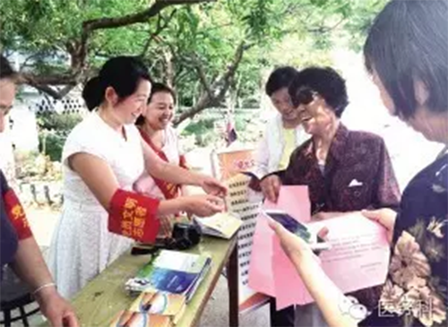 在職黨支部書記、副院長沈青在認(rèn)真給就診者免費(fèi)發(fā)放《云龍基礎(chǔ)文明15條》