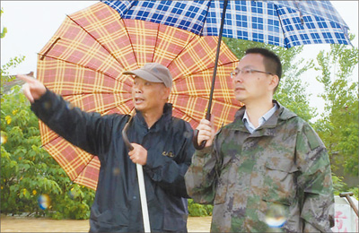 7月1日,安徽含山縣環(huán)峰鎮(zhèn)三龍村黨總支書記尹建平(左)在察看汛情。