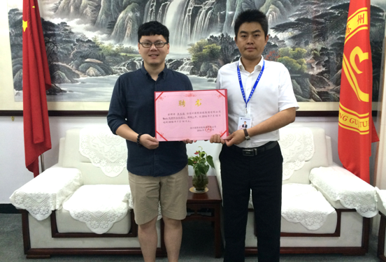 圖為圓聚集團(tuán)董事長(zhǎng)陳懷中向冉龍隆先生授權(quán)沃客線聘職業(yè)經(jīng)理人聘書