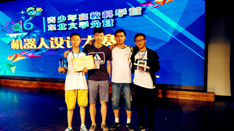 今年青少年高?茖W(xué)營東北大學(xué)分營舉辦了特色主體活動NEU_Robo機(jī)器人設(shè)計大賽,共有20支隊(duì)伍參賽,分為宣講、設(shè)計和比賽三個階段。在設(shè)計階段,每支參賽隊(duì)伍的參賽隊(duì)員需要綜合應(yīng)用機(jī)械設(shè)計、現(xiàn)代控制技術(shù)、傳感與檢測技術(shù)、機(jī)器視覺、計算機(jī)編程等多門學(xué)科的知識。在機(jī)器人比賽環(huán)節(jié)中分為巡線賽跑(沿預(yù)設(shè)的曲線行走)、貨物搬運(yùn)(把貨物搬運(yùn)到指定的區(qū)域)、極限挑戰(zhàn)(遇到障礙物時及時的停止)和創(chuàng)意設(shè)計(外觀外形的設(shè)計理念)四個部分。第一次參賽的新沂市第一中學(xué)代表隊(duì),面對強(qiáng)手如林的參賽隊(duì)伍,全體隊(duì)員團(tuán)結(jié)協(xié)作,克服專業(yè)知識的不足,合理分工,夜以繼日的投入到比賽中。從方案設(shè)計、修改到完善都包含著每一名隊(duì)員的心血和智慧。在巡線賽跑中,新沂市第一中學(xué)代表隊(duì)以1秒之差屈居第二。最終憑借其他項(xiàng)目均為滿分,最后綜合排名以亞軍的成績獲得一等獎。
