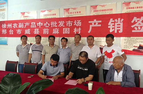 8月16日,徐州農(nóng)副產(chǎn)品中心批發(fā)市場副總經(jīng)理沈皓、總經(jīng)理助理魏禮寶、牛廣超等人來到河北省威縣洺州鎮(zhèn)前麻固村的葡萄基地,和當?shù)仄咸逊N植戶簽訂產(chǎn)銷協(xié)議,實現(xiàn)產(chǎn)銷對接。