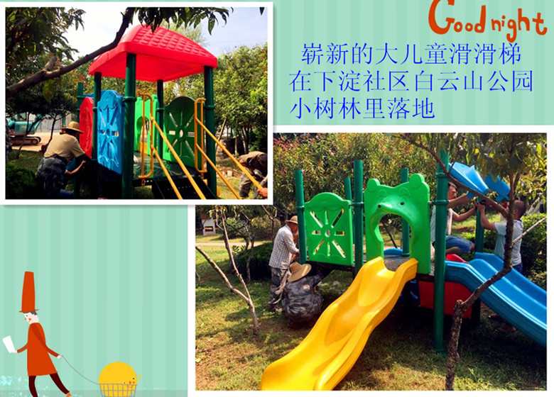 原來,付化友每天都要到白云山上鍛煉身體,由于處在假期,來公園玩耍的兒童每天都很多,雖然公園里有幾處蹺蹺板、搖搖車等兒童娛樂設(shè)施,但是當(dāng)兒童較多時,那些小玩意就成了搶手貨,好些小朋友經(jīng)常為爭搶搖搖車等發(fā)生吵鬧。付化友看在眼里,記在了心頭。加之他在鍛煉時也經(jīng)常聽到許多家長和小朋友反映再增加一些兒童設(shè)施的要求。事后,付書記和社區(qū)兩委領(lǐng)導(dǎo)合計(jì),決定再購進(jìn)一部分兒童喜愛的設(shè)施,于是,這部新添的兒童滑滑梯,就落戶在社區(qū)南邊的白云山公園小樹林里,讓這些兒童有了玩耍的好去處。