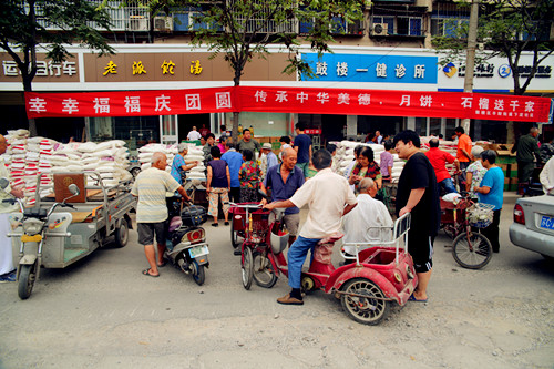 中國(guó)黃淮網(wǎng)江蘇徐州913日訊(老藤 亞?wèn)|)今天上午,在徐州市下淀路北側(cè),人潮涌動(dòng),笑聲連連。不少行人駐足相問(wèn):路邊擺這么多的面粉、油、月餅、石榴等十幾個(gè)品種,是展銷(xiāo)會(huì)嗎?不一會(huì)兒,樹(shù)上掛起了“幸幸福福慶團(tuán)圓”和“傳承中華美德,月餅、石榴送千家”的橫幅,落款為“鼓樓區(qū)豐財(cái)街道下淀社區(qū)”。即刻,大家相視一笑,流露出羨慕的眼光,“明白了,這是社區(qū)在為居民發(fā)放中秋節(jié)禮品呢。”