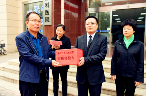 滕州啟明眼科醫(yī)院院長孫延旭(右二)向環(huán)衛(wèi)部門贈(zèng)送健康體檢卡