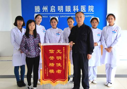 中國黃淮網(wǎng)山東滕州訊(采/編 黨同生) 日前,家住棗莊市市中區(qū)的12歲女孩王春萌,在家長帶領(lǐng)下來到滕州啟明眼科醫(yī)院,將繡有“光明使者 信譽(yù)楷模”的錦旗敬贈給該院視光中心角膜塑形組帶頭人傅瀟儀醫(yī)生。