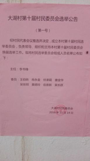 注:村書記 李某某 被媒體報(bào)道后,被責(zé)令停職。為什么還能去改動(dòng)賬目、還能繼續(xù)兼另外一個(gè)村的村書記?并且在 2016 年 11 月 14 日,并出現(xiàn)在了大湖村第十屆村民委員會(huì)選舉公告名單上?難道說開發(fā)區(qū)的選舉舉報(bào)電話只是一個(gè)擺設(shè)嗎?      大湖村全體黨員和群眾的呼聲