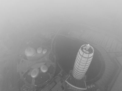 昨日中午,記者利用無人機(jī)爬升到最高升限500米仍舊沒能突破霧霾層,鏡頭中的﹃大玉米﹄籠罩在一片混沌當(dāng)中。