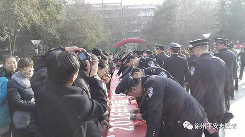 12月2日,沛縣平安志愿者協(xié)會在沛縣召開了平安志愿者千人宣誓簽名大會,F(xiàn)場發(fā)放了平安志愿者宣傳資料2000余份,并開展了平安志愿者招募活動。各平安志愿者代表在沛縣平安志愿者協(xié)會會旗上簽名;顒哟罅π麄髁似桨仓驹刚叻⻊瘴幕,廣泛傳播了“奉獻、友愛、互助、進步”的平安志愿精神理念,強化了群眾共建美麗家園的意識。