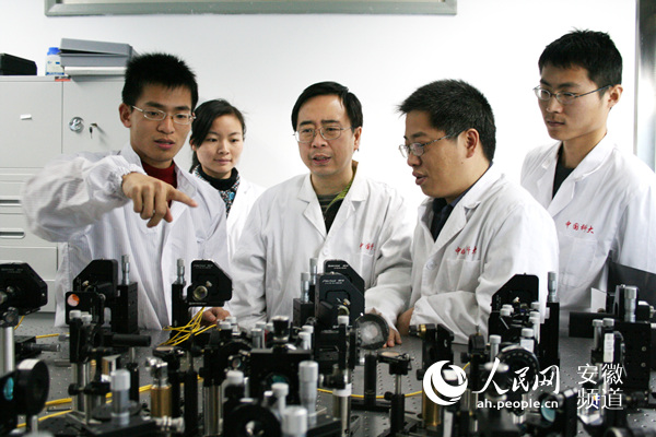圖為中科院量子科學(xué)實(shí)驗(yàn)衛(wèi)星先導(dǎo)專項(xiàng)首席科學(xué)家潘建偉(中)在實(shí)驗(yàn)室工作中。(中科大供圖)