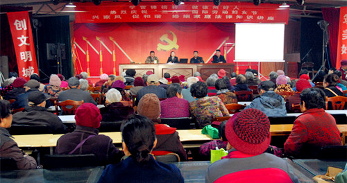 中國(guó)黃淮網(wǎng)訊(老藤)35上午,在徐州下淀社區(qū)黨員服務(wù)中心主席臺(tái)上,除了社區(qū)黨委書(shū)記,社區(qū)主任外,還有兩位法官就坐。這是下淀社區(qū)黨委組織的學(xué)雷鋒、慶“三八”、黨員冬訓(xùn)講座、宣傳推進(jìn)爭(zhēng)創(chuàng)全國(guó)文明城市活動(dòng)大會(huì)。本來(lái)只能容下500余人的會(huì)場(chǎng)早已經(jīng)座無(wú)虛席,連座位兩旁的通道也擠滿了前來(lái)參加大會(huì)的社區(qū)全體涉農(nóng)老年人、離退休黨員、社區(qū)工作人員、居民代表和志愿者。