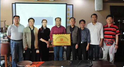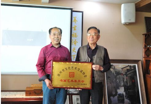 徐州市文化藝術(shù)交流協(xié)會書畫專業(yè)委員會顧問張景田(右)向藝委會主任授牌