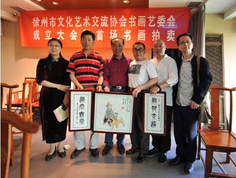 徐州市文化藝術(shù)交流協(xié)會會長李繼玲、副會長孔伯祥、書畫藝術(shù)委員會主任王桂才與書畫家及成功獲拍的人員合影