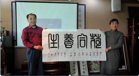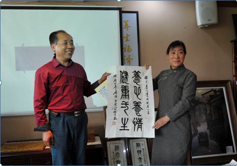 徐州市文化藝術(shù)交流協(xié)會書畫專業(yè)委員會主任王桂才(左)向合荷養(yǎng)生會所贈送書法作品