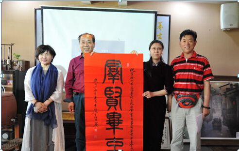 書畫藝術(shù)委員會第一屆理事會選舉王桂才(中)、尹健(右)、孝衍斌(右二)、趙鴻(左一)、高揚為常務(wù)理事