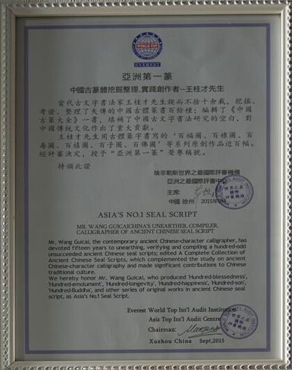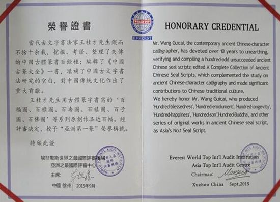 王桂才獲得吉尼斯“亞洲第一篆”認(rèn)證牌匾和證書