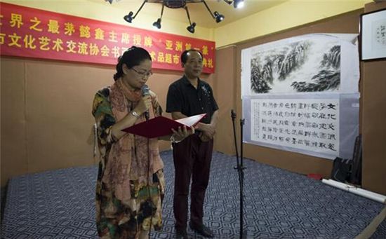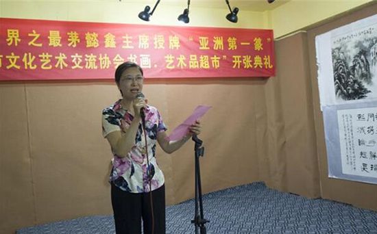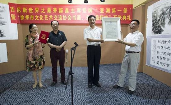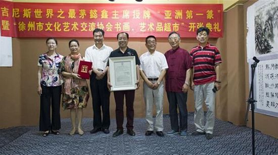 中國黃淮網(wǎng)訊(尹。6月16日上午,徐州戶部山下,徐州市文化藝術(shù)交流協(xié)會書畫超市內(nèi),群賢齊聚,賓朋滿座。一條“吉尼斯世界之最”茅懿鑫主席授牌“亞洲第一篆”暨徐州市文化藝術(shù)交流協(xié)會書畫、藝術(shù)品超市開張典禮”的大紅橫幅十分醒目,值徐州市文化藝術(shù)交流協(xié)會書畫、藝術(shù)品超市開業(yè)典禮之際,“埃菲勒斯世界之最”國際評審機(jī)構(gòu)、“亞洲之最”評審中心主席茅懿鑫先生,副主席戴中禮先生,法務(wù)部主任胡永年先生,總干事朱珉女士一行專程趕來為徐州市文化藝術(shù)交流協(xié)會書畫專業(yè)委員會王桂才主任頒發(fā)了“亞洲第一篆”榮譽(yù)證書。徐州市文化藝術(shù)交流協(xié)會會長李繼玲、副會長孔伯祥、交流協(xié)會藝術(shù)顧問張景田以及交流協(xié)會藝術(shù)委員會理事會成員、部分企業(yè)家、詩書畫藝術(shù)家代表100多人參加了開幕式和授牌儀式。