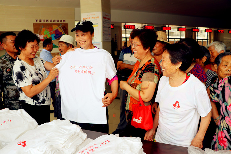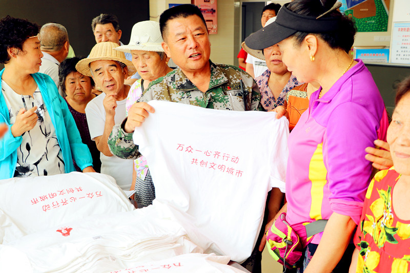 中國黃淮網(wǎng)徐州622訊(老藤)今天上午,徐州下淀社區(qū)1300多名居民高高興興的穿上了件胸前印有雷鋒頭像、后背印有“萬眾一心齊行動(dòng),共創(chuàng)文明城市”的“文化衫”。