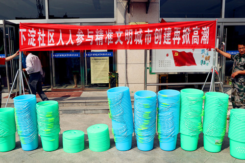 由于這是為美化城市環(huán)境而定制的專用垃圾桶,社區(qū)要求各家各戶都要按照創(chuàng)建活動統(tǒng)一部署擺放。為了取得“一舉兩得”,宣傳創(chuàng)建活動人人有責(zé)的效果,社區(qū)還特別在桶上印上了“創(chuàng)全國文明城市·垃圾桶·下淀社區(qū)”字樣,以避免他用。