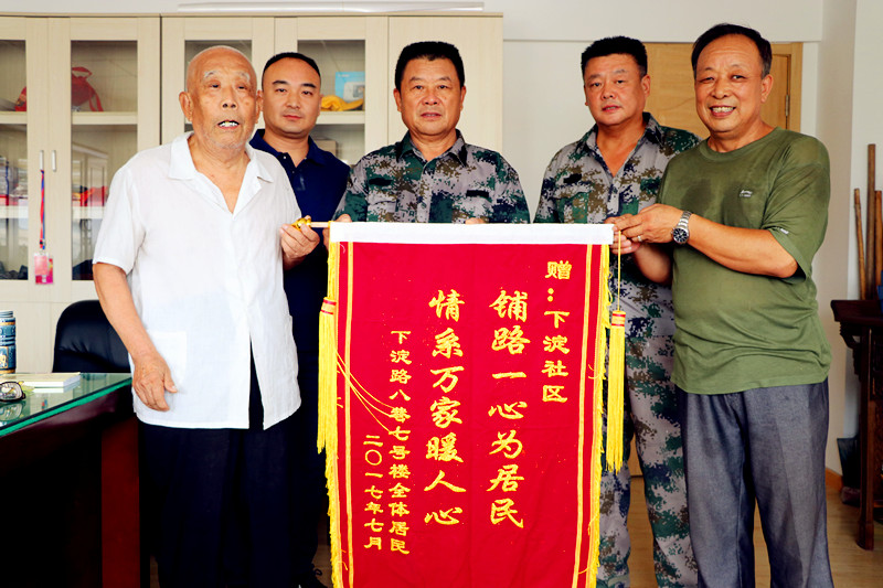 中國黃淮網(wǎng)訊(老藤)729下午,徐州下淀路87號樓全體居民推選80歲的老黨員劉永范和62歲的佟大全專程到下淀社區(qū)向黨委書記付化友同志送上一面“鋪路一心為居民,情系萬家暖人心”的錦旗,以表謝意。