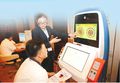 7月6日,金磚國家衛(wèi)生部長會暨傳統(tǒng)醫(yī)藥高級別會議在天津召開,參會人員體驗中醫(yī)綜合檢測系統(tǒng)。