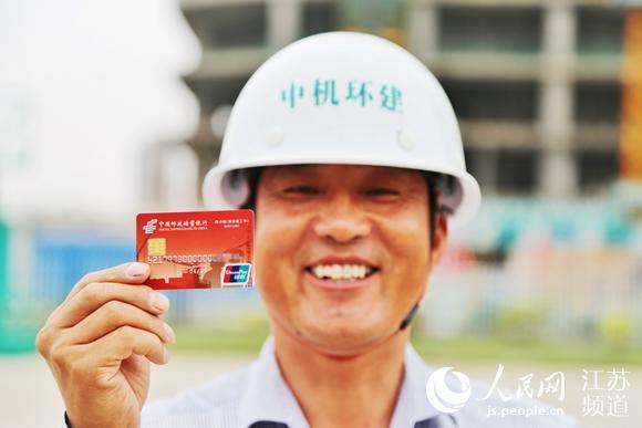 圖為淮安市金融中心工地上手持工資卡的農(nóng)民工 馬燾燾攝