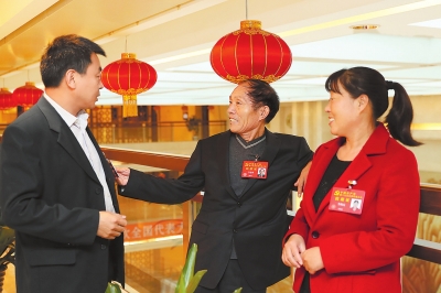 河南團(tuán)代表在會(huì)議間隙討論報(bào)告