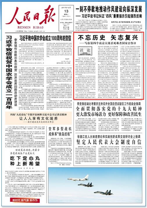 “誰忘記歷史,誰就會在靈魂上生病。”80年過去,侵略者的槍聲淹沒在歷史塵埃里,但中華門城墻上的彈孔依然清晰可見;南京城的不絕哀號已隨風(fēng)逝去,但“萬人坑”的累累白骨還在。歷史不會因時代變遷而改變,事實也不會因巧舌抵賴而消失。南京大屠殺慘案鐵證如山、不容否認(rèn)。任何倒行逆施妄圖篡改歷史、否認(rèn)暴行,為南京大屠殺慘案和侵略戰(zhàn)爭翻案的丑惡行徑,不僅13億中國人民不會答應(yīng),也將受到世界上一切愛好和平與正義人民的譴責(zé)和唾棄。“國之大事,在祀與戎。”年復(fù)一年的國家公祭向世人宣示,中國人民反對侵略戰(zhàn)爭、反對篡改歷史的立場堅定不移,中國人民團結(jié)一心實現(xiàn)民族復(fù)興的決心堅定不移,中國人民捍衛(wèi)人類尊嚴(yán)、維護世界和平的意志堅定不移。