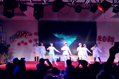 《咖喱咖喱》讓我們感受到了醫(yī)護人員的青春與魅力,他們的精彩表演感染了全場,如火的熱情感染了每一位觀眾;今年工作干得好,咱們千萬別驕傲,新的一年新氣象,加油.......三句半將醫(yī)院職工過去一年的辛勤耕耘以及醫(yī)院發(fā)展所取得的佳績進行了熱情的謳歌,無不給人帶來賞目悅心的快樂與感動;檢驗科的情景劇《檢驗科的故事》將晚會的喜慶氛圍推向了另一個高潮,他們將現(xiàn)在的醫(yī)患關系用詼諧的語言道出,引得臺下叫好聲不斷;獨唱《大槐樹下的故事》、《天下父母》及歌舞《三生三世》等節(jié)目輪番上陣,精彩紛呈,每個節(jié)目都宛如一個個跳躍的音符,匯成了一曲美妙和諧的旋律,歡樂的歌聲和曼妙的舞姿引起陣陣歡呼喝彩。