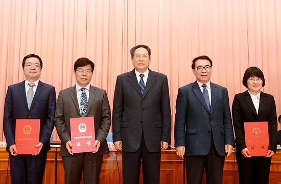 2月23日,安徽省科學(xué)技術(shù)獎(jiǎng)勵(lì)大會(huì)在合肥召開(kāi)。省委書(shū)記李錦斌、中科院院長(zhǎng)白春禮為重大科技成就獎(jiǎng)獲得者陳仙輝(左二)、謝毅(右一)、吳劍旗(左一)頒獎(jiǎng)。記者 徐國(guó)康 攝