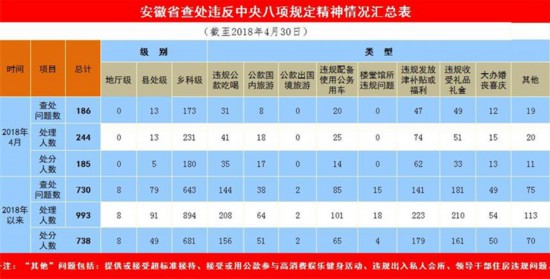 今年1至4月,安徽省各級紀(jì)檢監(jiān)察機(jī)關(guān)查處違反中央八項(xiàng)規(guī)定精神問題730個(gè),處理993人,處分738人。其中,4月查處此類問題186個(gè),處理244人,處分185人。