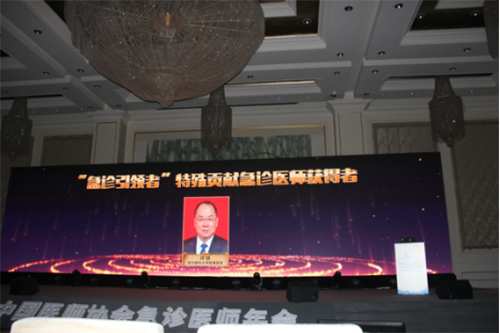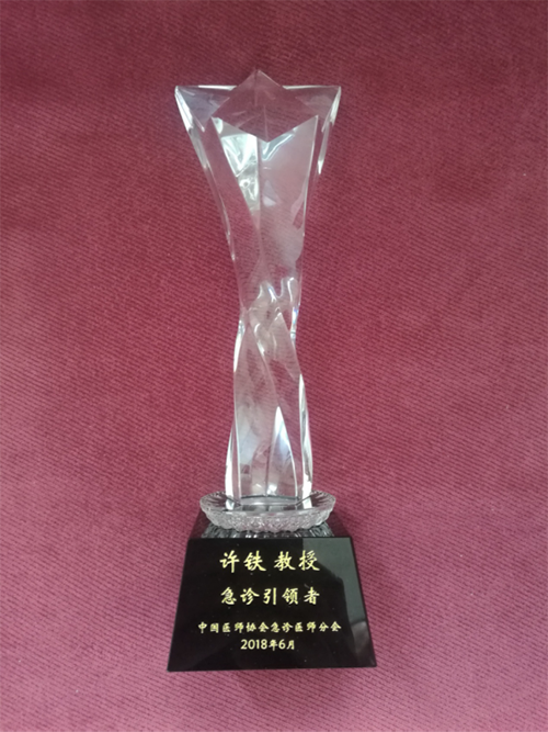 在本次會議的開幕式上,頒發(fā)了專門為全國急診醫(yī)師設(shè)立的獎項,許鐵教授被授予“‘急診引領(lǐng)者’特殊貢獻(xiàn)急診醫(yī)師”獎。該獎項在全國范圍內(nèi)遴選,限額為10名,授予為我國急診醫(yī)學(xué)事業(yè)作出突出貢獻(xiàn)、并擔(dān)任急診科主任及以上職務(wù)至少 10 年的急診醫(yī)學(xué)的學(xué)科帶頭人,是經(jīng)中國醫(yī)師協(xié)會批準(zhǔn)的對急診醫(yī)師的最高褒獎。中國醫(yī)師協(xié)會張雁靈會長、國家衛(wèi)健委醫(yī)政醫(yī)管局焦雅輝副局長、中國醫(yī)師協(xié)會急診醫(yī)師分會于學(xué)忠會長等領(lǐng)導(dǎo)和嘉賓為獲獎?wù)哳C發(fā)了獎杯和證書。頒獎詞是:沉淀半生的急診科引領(lǐng)者們,任歲月白頭,初心不改練就大醫(yī)妙手,救萬千患者于危難之時。與死神賽跑是他們永恒不變的信念!