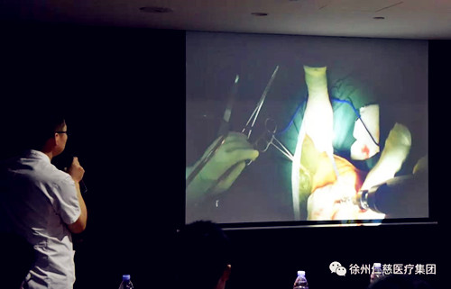 關(guān)節(jié)科蔣守海主任在學術(shù)沙龍現(xiàn)場,解說直播過來的計算機導航關(guān)節(jié)置換手術(shù)。