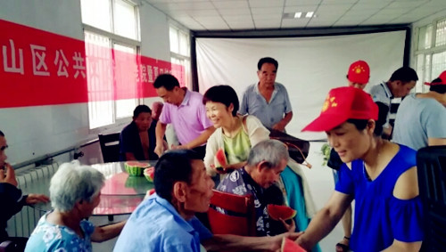 烈山區(qū)文旅體局黨組書記王鳳華與老人邊看電影邊聊天,通過聊天了解他們生活上需求,以及精神文化生活的需求。老人們更需要的是關(guān)心、是陪伴。局機(jī)關(guān)黨員干部把西瓜送到老人手中,傳遞黨對人民群眾的關(guān)愛。