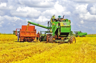 位于莫桑比克加扎省首府賽賽的萬寶莫桑農(nóng)業(yè)園項目是目前中國在非洲最大規(guī)模水稻項目。圖為不久前在萬寶莫桑農(nóng)業(yè)園,收割機將稻谷傳輸至卡車。