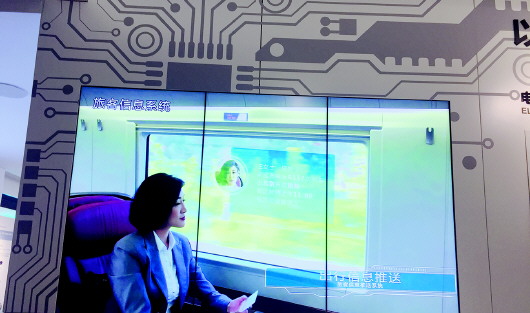 “在車廂內(nèi)通過服務(wù)器將互聯(lián)網(wǎng)信號(hào)轉(zhuǎn)為Wi-Fi信號(hào),并與既有旅客信息系統(tǒng)對(duì)接,為乘客提供衛(wèi)星電視直播、互聯(lián)網(wǎng)接入功能,同時(shí),乘客可通過專為列車應(yīng)用開發(fā)的終端APP軟件,享受車廂內(nèi)音視頻點(diǎn)播、列車購物、乘務(wù)員互動(dòng)等服務(wù),還可掌握列車運(yùn)行狀態(tài)等信息。”工作人員介紹,有了這套系統(tǒng),乘客可直觀感受到“數(shù)字化列車”帶來的智能運(yùn)維新體驗(yàn),也能感受“智慧車窗”及“魔鏡”的神奇功能,讓參觀者在指尖互動(dòng)中零距離感受“未來列車”的智能與便利。