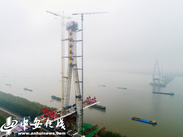 據(jù)了解,池州長江大橋北岸(樅陽岸)主塔高237米,相當(dāng)于79層樓高;南岸(池州岸)主塔高243米,相當(dāng)于81層樓高,計劃下月底封底。主塔采用了花瓶形索塔設(shè)計,兩個上塔柱之間通過6道鋼橫梁連接,鋼橫梁外包琉璃金黃色鋼球。主塔采用國內(nèi)首創(chuàng)的皮膚功能混凝土澆筑和集聚錨鋼橫梁工藝,不僅解決了錨固區(qū)混凝土開裂的問題,而且增強(qiáng)了主塔結(jié)構(gòu)強(qiáng)度。