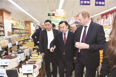 蘇果超市黨委書記、總經(jīng)理陳兵(圖中)陪同白俄羅斯莫吉廖夫州執(zhí)委會(huì)主席多瑪涅夫斯基(右一)參觀蘇果門店。